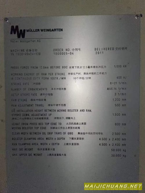 精品上市,汽车冲压线知名国际品牌米勒万家顿1000。SPM 8-21机器人上料,全封闭,全自动化机械手行程1200mm,装模高度1500mm双侧移工作台,尺寸4500*2400_ 信息编号:S564216 |